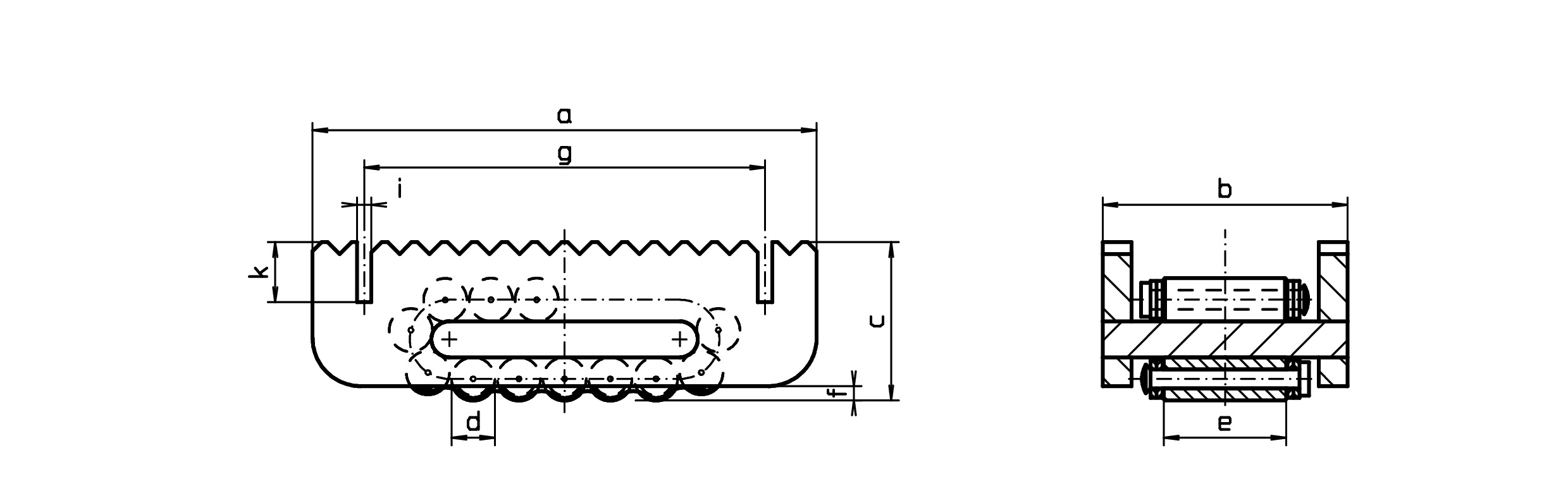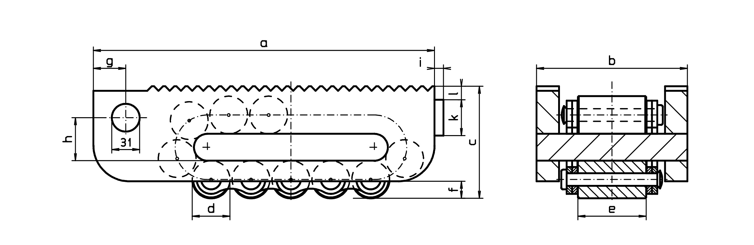 | Größe | a | b | c | Ød | e | f | g | h | i | k | l | trag. Rollen | Rollen anzahl | Tragkraft max kN | Gewicht kg |
